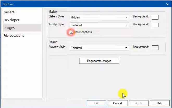 To do this select File > Options > Images, check the 'Show captions' checkbox, and select 'OK'.