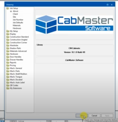 3. Once CabMaster has opened, you will see a Drawing Properties window pop up. During this initial set up, leave Drawing Properties as default by click